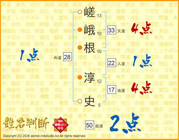 嵯(13画)峨(10画)根(10画) 淳(12画)史(5画)