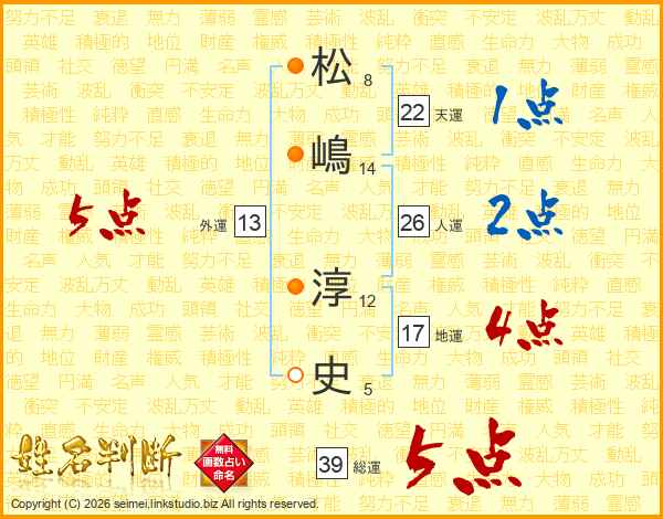 松(8画)嶋(14画) 淳(12画)史(5画)