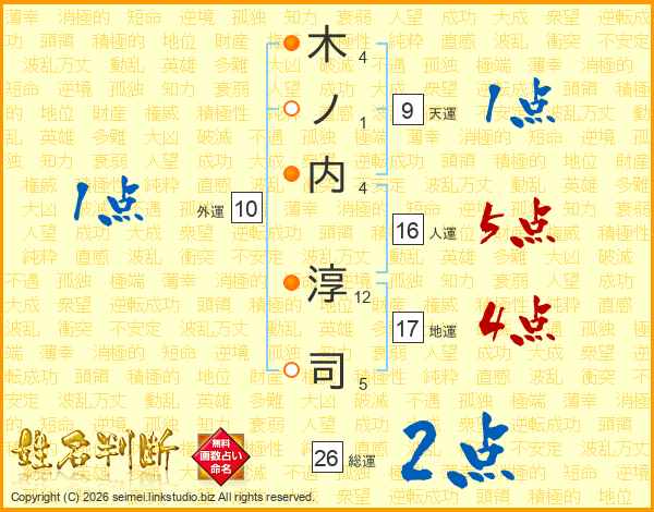 木(4画)ノ(1画)内(4画) 淳(12画)司(5画)