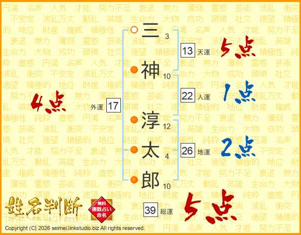 三(3画)神(10画) 淳(12画)太(4画)郎(10画)