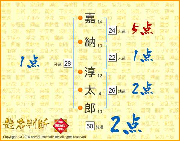 嘉(14画)納(10画) 淳(12画)太(4画)郎(10画)