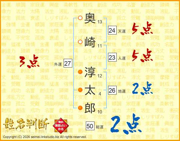 奥(13画)崎(11画) 淳(12画)太(4画)郎(10画)