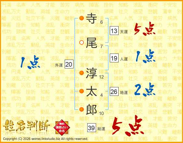 寺(6画)尾(7画) 淳(12画)太(4画)郎(10画)