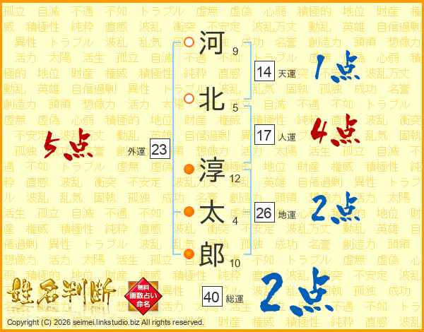 河(9画)北(5画) 淳(12画)太(4画)郎(10画)
