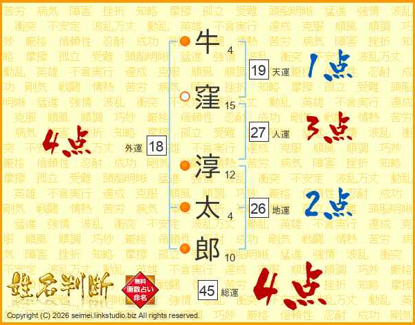 牛(4画)窪(15画) 淳(12画)太(4画)郎(10画)