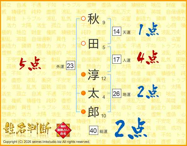 秋(9画)田(5画) 淳(12画)太(4画)郎(10画)