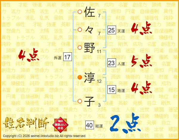 佐(7画)々(7画)野(11画) 淳(12画)子(3画)