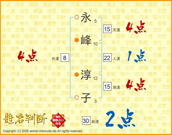 永(5画)峰(10画) 淳(12画)子(3画)