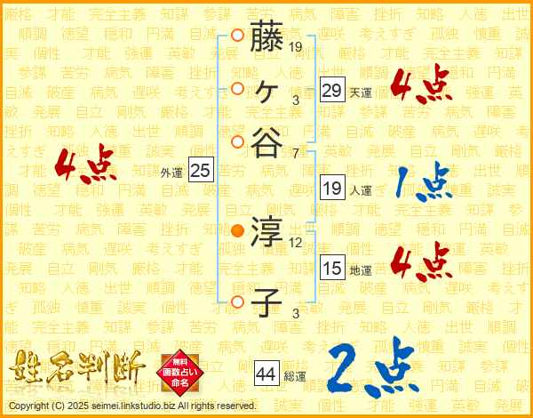 藤(19画)ヶ(3画)谷(7画) 淳(12画)子(3画)