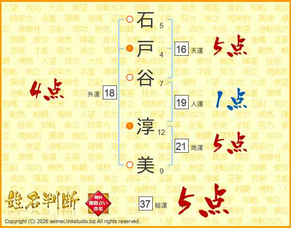 石(5画)戸(4画)谷(7画) 淳(12画)美(9画)