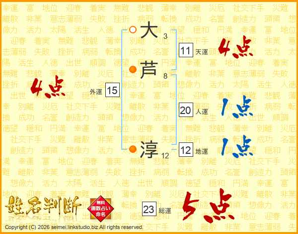 生活面を象徴する運勢です。外部から受ける影響力を表し、結婚運、家庭運や職場、環境への順応性を表します。総運から人運を引いた画数。姓や名が1文字の場合を除く。