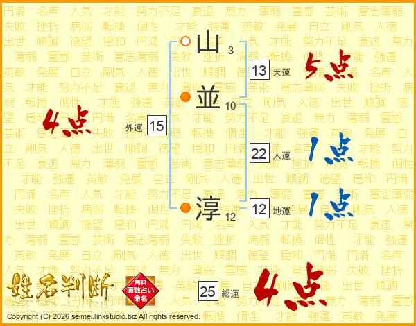 生活面を象徴する運勢です。外部から受ける影響力を表し、結婚運、家庭運や職場、環境への順応性を表します。総運から人運を引いた画数。姓や名が1文字の場合を除く。