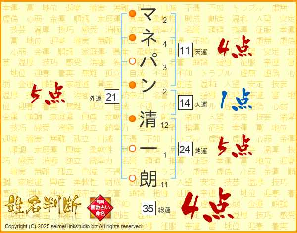 マ(2画)ネ(4画)パ(3画)ン(2画) 清(12画)一(1画)朗(11画)