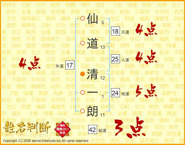 仙(5画)道(13画) 清(12画)一(1画)朗(11画)