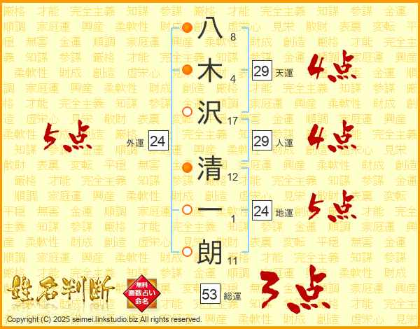 八(8画)木(4画)沢(17画) 清(12画)一(1画)朗(11画)