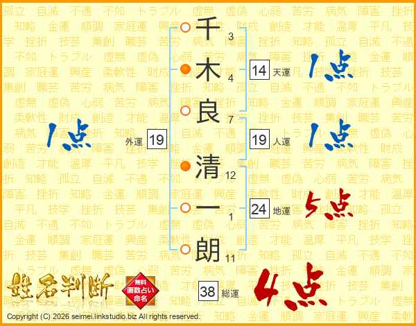 千木良清一朗さんの総運は38画の4点!