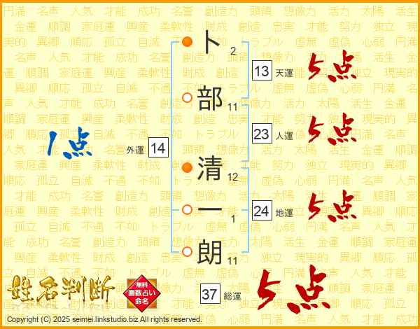 生活面を象徴する運勢です。外部から受ける影響力を表し、結婚運、家庭運や職場、環境への順応性を表します。総運から人運を引いた画数。姓や名が1文字の場合を除く。