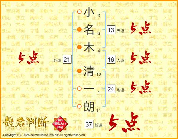 小(3画)名(6画)木(4画) 清(12画)一(1画)朗(11画)