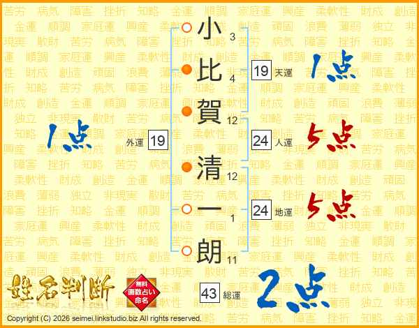 小(3画)比(4画)賀(12画) 清(12画)一(1画)朗(11画)