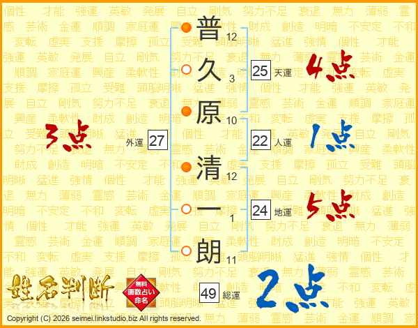 普(12画)久(3画)原(10画) 清(12画)一(1画)朗(11画)