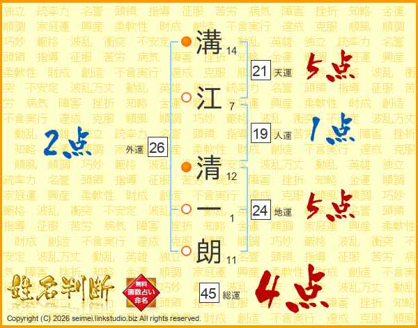 溝(14画)江(7画) 清(12画)一(1画)朗(11画)