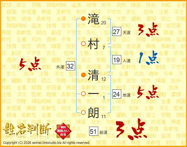 滝(20画)村(7画) 清(12画)一(1画)朗(11画)