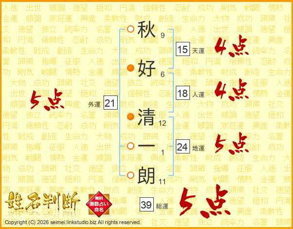あなたの人生を表す1番重要な運勢です。生涯を通じて影響する総合運となり、主に50歳以降の晩年期に影響を及ぼします。苗字と名前の合計画数。