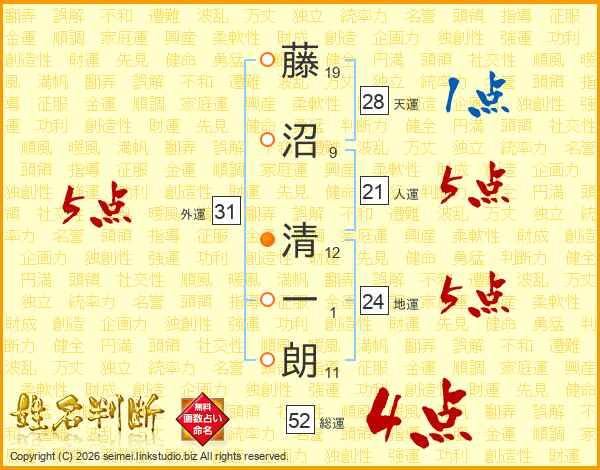 藤(19画)沼(9画) 清(12画)一(1画)朗(11画)