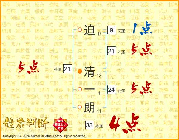 あなたの人生を表す1番重要な運勢です。生涯を通じて影響する総合運となり、主に50歳以降の晩年期に影響を及ぼします。苗字と名前の合計画数。