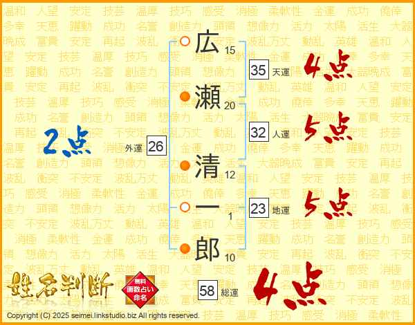 広(15画)瀬(20画) 清(12画)一(1画)郎(10画)