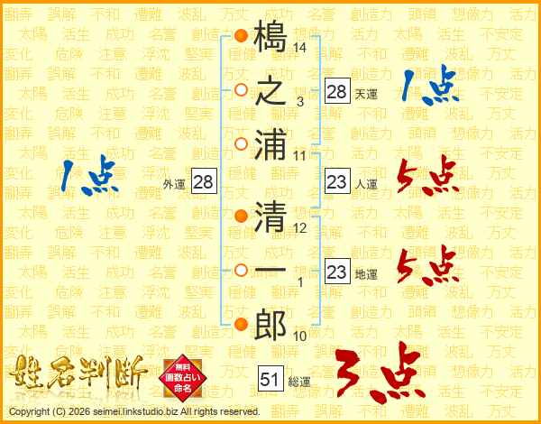 槝(14画)之(3画)浦(11画) 清(12画)一(1画)郎(10画)