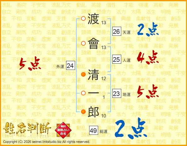 渡(13画)會(13画) 清(12画)一(1画)郎(10画)