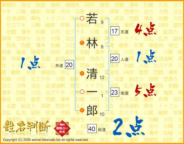 若(9画)林(8画) 清(12画)一(1画)郎(10画)