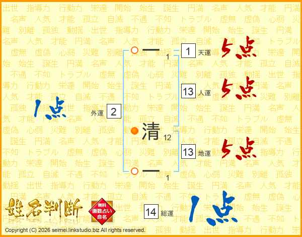 生活面を象徴する運勢です。外部から受ける影響力を表し、結婚運、家庭運や職場、環境への順応性を表します。総運から人運を引いた画数。姓や名が1文字の場合を除く。