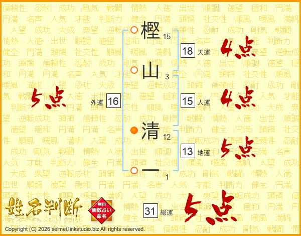 あなたの人生を表す1番重要な運勢です。生涯を通じて影響する総合運となり、主に50歳以降の晩年期に影響を及ぼします。苗字と名前の合計画数。