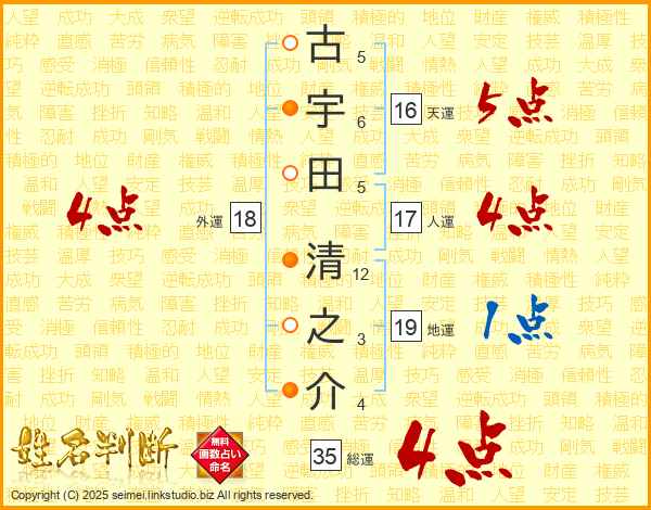 古(5画)宇(6画)田(5画) 清(12画)之(3画)介(4画)