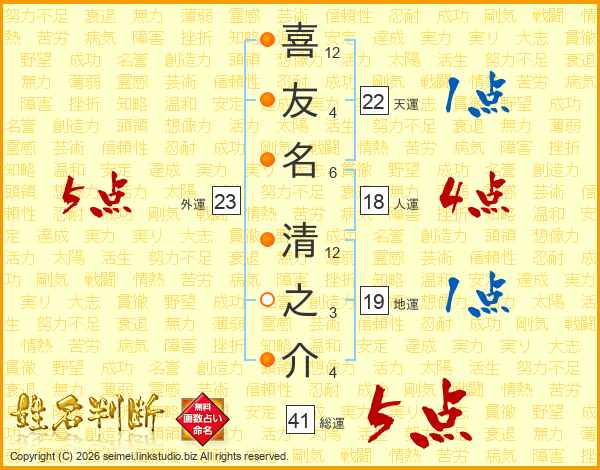 喜(12画)友(4画)名(6画) 清(12画)之(3画)介(4画)