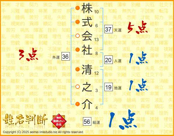 株(10画)式(6画)会(13画)社(8画) 清(12画)之(3画)介(4画)