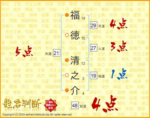 福(14画)徳(15画) 清(12画)之(3画)介(4画)