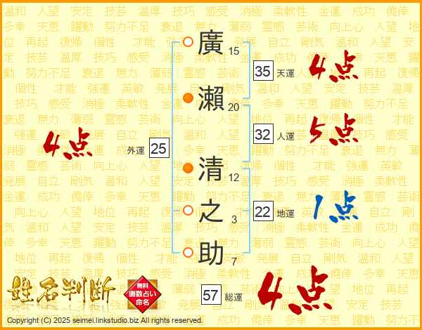 廣(15画)瀨(20画) 清(12画)之(3画)助(7画)