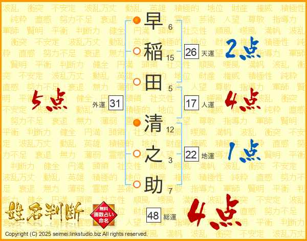 早(6画)稲(15画)田(5画) 清(12画)之(3画)助(7画)