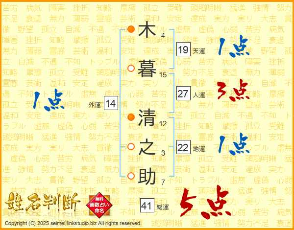 木(4画)暮(15画) 清(12画)之(3画)助(7画)
