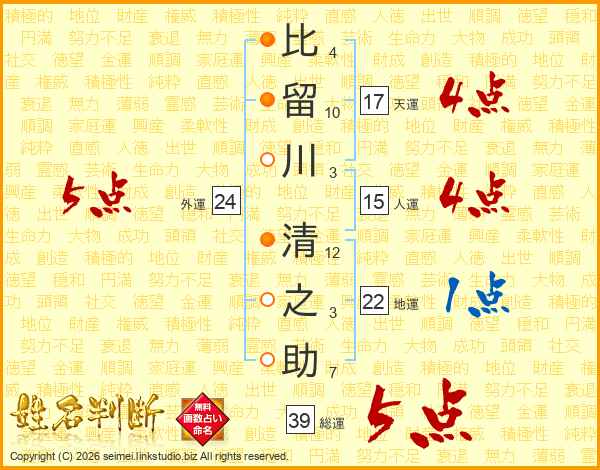 比(4画)留(10画)川(3画) 清(12画)之(3画)助(7画)