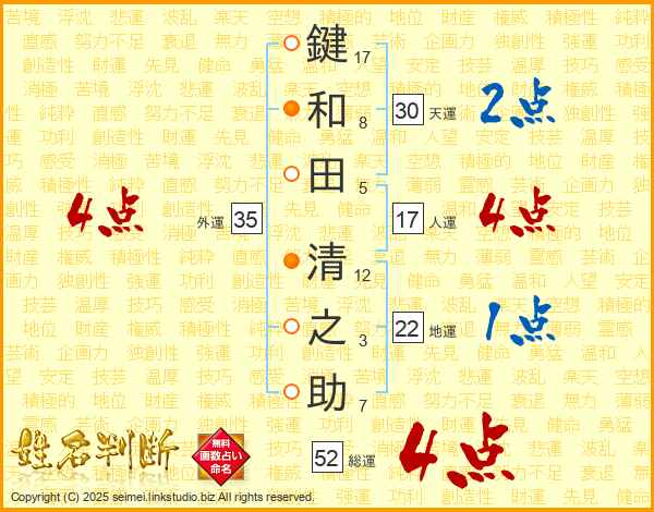 鍵(17画)和(8画)田(5画) 清(12画)之(3画)助(7画)