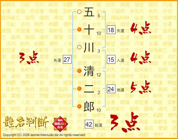 五(5画)十(10画)川(3画) 清(12画)二(2画)郎(10画)