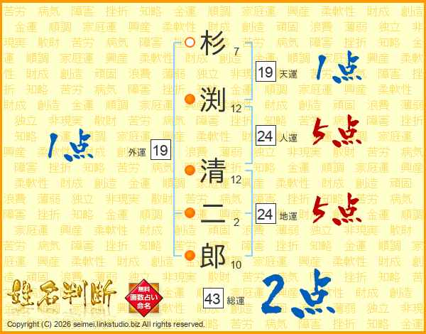 杉(7画)渕(12画) 清(12画)二(2画)郎(10画)
