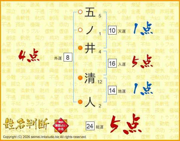 五ノ井清人さんの総運は24画の5点!