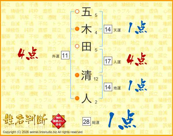 生活面を象徴する運勢です。外部から受ける影響力を表し、結婚運、家庭運や職場、環境への順応性を表します。総運から人運を引いた画数。姓や名が1文字の場合を除く。