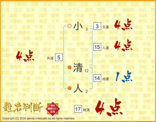 生活面を象徴する運勢です。外部から受ける影響力を表し、結婚運、家庭運や職場、環境への順応性を表します。総運から人運を引いた画数。姓や名が1文字の場合を除く。