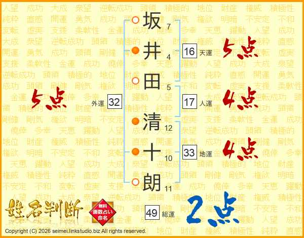 坂(7画)井(4画)田(5画) 清(12画)十(10画)朗(11画)